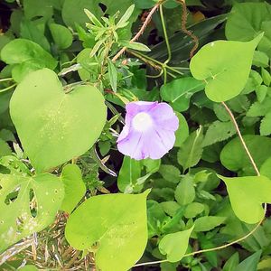 蔓が問題になっているハスノハヒルガオ(Merremia Peltata)の花を探して山歩きしてたら、この花を見つけました。ハスノハヒルガオの花は白か黄色のようです。これもヒルガオの一種だとは思うのですが、名前、わかりますか? 薄紫色で、葉の形は上部に写っていますが、ハート型で広いです。