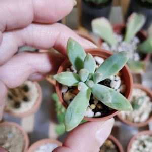 今日の多肉ちゃん 相変わらずの名無しさんです。(購入した所に記載のある名前で調べた所ジェットバースの可能性大) 全体的に大きく肉厚にはなっていますがいつ見ても変化していないように見える子です。 この子は誰なんだろなぁ