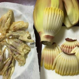 こんばんは〜〜❣️ テレビでバナナの房のまだ、花の咲かない苞の部分を天ぷらにして食べていました 食べれるんだ〜〜❣️ 物は試し*\(^o^)/* 丁度昼間、切り落とし、ゴミにすてようと、ビニール袋に入れていたのをもちだして一枚一枚、剥がして行くと、そこには、可愛らしいミニバナナの行列が‥‥‥笑 早速天ぷらに‥‥‥ 生をかじって、口の中が、信じられない位の渋さで、悶絶(笑)した事があり 笑 食べてる人が、(うん!いける!)の言葉を信じ いざ試食❣️ ビミョー💦💦💦 やっぱりバナナはバナナで食べるのが 一等賞😄💕💕💕