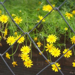アメリカンフェンスの後ろの花達 ばら蒔いた種からの開花 ダールベルグデージーのお花 垂れ感が可愛い🌼*・🌼*・ 厳しい西日に元気が無かったサマーラッシュ 少し元気が出てきました🤍❤️ 久しぶりのモニター投稿です😅