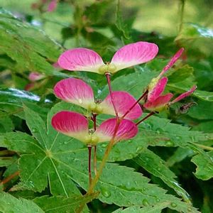 イロハもみじ たくさんプロペラつけてます。 萌える緑と雨つぶとのコントラストが綺麗です。