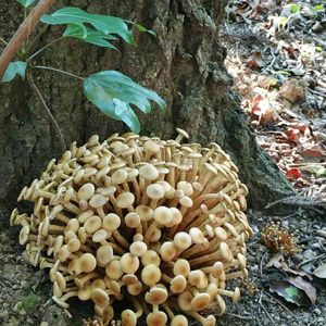 大きな木の根元に卵ボーロのような色のキノコが、半円球の形にまとまって生えていました。直径15㎝くらいありました(^_^) そばに小さなキノコのかたまりもあって、それも、成長したら、こんな姿になるのかな(・・?