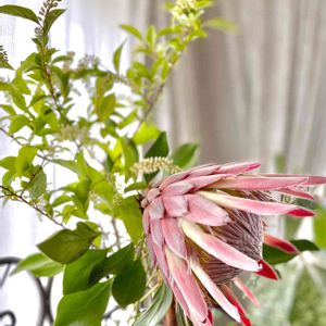 キングプロテア♛︎ 今日生け込みからおろしました。 GET成功!! ようこそ、憧れのキミ。 正面の強い感じもイイけど 横顔もうなじも撫でたくなるほど素敵✧︎*。 ソファーに寝転んで眺められる所に配置。 あぁ幸せ・:*:・(*´艸`*)・:*:・