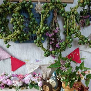 寒くなり霜が降りたので全て採りました! 鉢植えの2本の苗から90個ほど大小の実が出来ました! 早くに赤くなった物がシワシワになったり、黒く成ったりした物が10個! 夜な夜な遊びミシンテーブルの上でリースにしました❣️ 結構な重さです! 下げた時に実は、この位置で見たいので❗️ 蔓が乾燥する迄平置きです。 緑濃いものから徐々に赤く色付きそうです! 初めて作ったので分からないのですが、赤く成ると長持ちしないのですかね? 種がいっぱい有るので又、来年も...