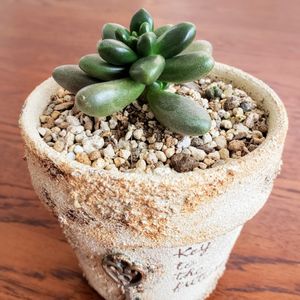 今日はつぶつぶの日ですね🎵 わが家のかわいいつぶつぶを見つけました‼️😃✨ 🏷️つぶつぶの日 参加させてください。😄 脇芽が出ているのを発見❕👀 鉢は、昨夏ぐんまフラワーパークで開かれた古花市でお迎えした、machagoroさん作のものです。😊🎶 頑張れ❗日本‼️ 👊✨ 追記 緑亀の卵かと思っていましたが、クロコダイルだということがわかりました。 ごめんなさい。🙇💦