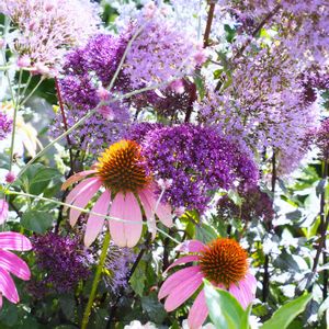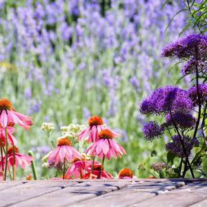 ウッドデッキの向こう側 家の中から📸 ウッドデッキの向こう側、背の高いユウギリソウとエキナセアとノコギリソウが見えますね。エキナセアはもっと濃い色ですが、色が飛んでいます😅 奥の薄紫はラベンダーグロッソです💜 毎年撮っているので、今年も撮ってみました📸