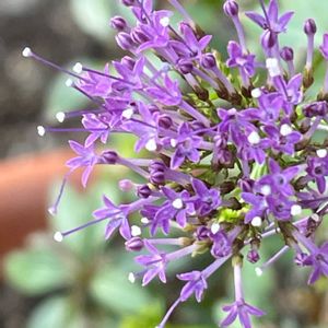 紫色のちっちゃなお花からピヨォ〜ンと飛び出した雄しべ(?)のてっぺんに、白いツブツブがキラキラと光ってます。😊 涼しげでユニークな姿ですよネェ〜 お初にお目にかかりましたぁ〜😄 お名前は「ユウギリソウ(夕霧草)」さんでした。😘