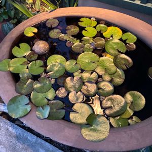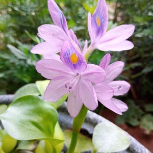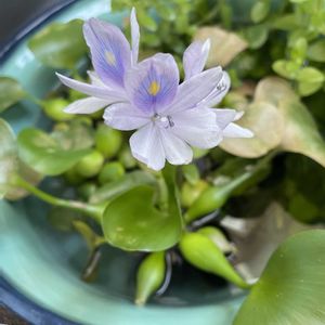 ホテイアオイ.(ホテイソウ)メダカ鉢に浮かべてみました💜(メダカはいませんが…💦)お花咲くかな🙄あの綺麗なお花が見たくて🩵