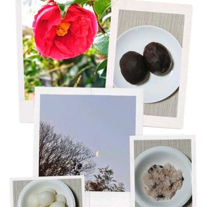 椿✨ 朝 名残りの半月、下弦の月🌗 今日はお彼岸明けです🕯️ 入りぼた餅、明け団子、中日小豆飯 頑張りました😅
