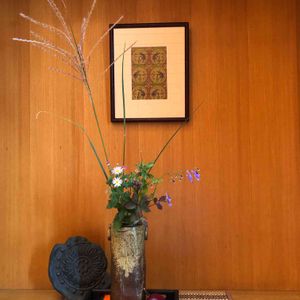 秋祭りの日 お下がりの落雁とちょっとすました玄関です。暴れん坊のアキチョウジが良い感じを出してくれました。