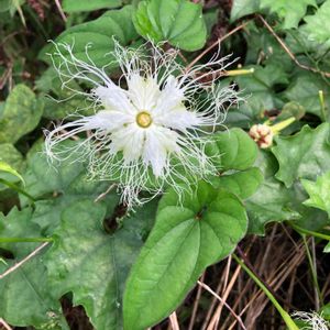 よその畑の端っこに烏瓜の花発見‼︎ 毎年オレンジの実ができるのを楽しみにしていますが、実まで綺麗に出来たのを見られないです。花びらの先の糸が美しい花です。