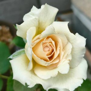 5/6 昨日咲いた2年目のサーシャ「こてと」(鉢の名前)💕優しき色です。 今日はお天気が一転。青空が恋しい。。