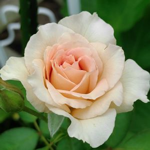 10/5 サーシャ「こてと」(鉢の名前)💕身の丈50センチのスリム美人さん。夏顔なので全くの白バラになっちゃってますが、香りは良いの。右は水曜日に咲きました。2年目の夏を乗り切りましたね✌️なぜかラスカルがペンギン鉢に住み着いちゃってる😄
