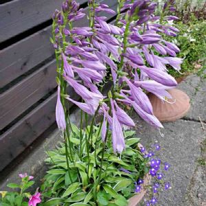 ギボウシ やっと咲いた(*ฅ́˘ฅ̀*)♡ ほかのギボウシより1ヶ月遅れでした‼️ 隙間からこぼれ種で勝手に育ったロベリアも可愛い❤️