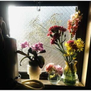 【季節の花華シリーズ:出窓に飾った花華』 📝キッチンの出窓に飾っている花華たちを、窓越しに朝陽がさして照らしています。 左から順に→ @浄水器 🌸胡蝶蘭x2株/鉢植え 🌸3種のピンク色の花華:薔薇・紫陽花・ブーゲンビリア/グラスコップの中に(直前に投稿) 🌸色々な花華:霞草・カーネーション・グラジオラス・スプレーマム/花瓶の中に 《一九献上》 「キッチンの 出窓忙し 花飾り」 @訳意:The kitchen bay window has also been kept busy, decorated with seasonal floral displays. ;キッチンの出窓も季節の花々で飾られ、賑やかに保たれています。 🗒️これらはいずれもパートナーの仕業デス🐶 ✍️Works;Poetaster Kazyan//筍歌人:藪中和堂 Artistic:Season’s flowers April 27,2025:past am 07:00’;📱shooting April 27,2025:past am 07:50’;upload by Kazyan’s Green Studio