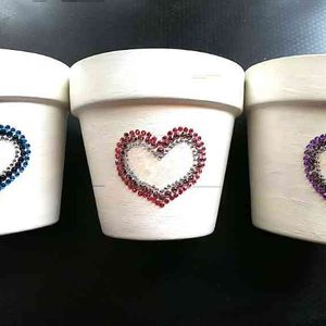 今日はオフホワイトに塗った鉢に紫のハートデコ*\(^o^)/* ハートの真ん中は白いラメで塗りました(*^^*) 色違いのストーンで三色おそろいを作る予定〜 白い部分シンプルすぎるかなあ•́ω•̀)