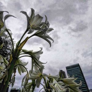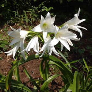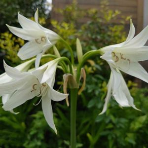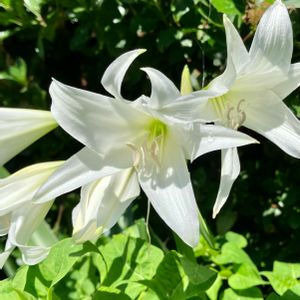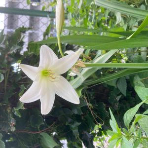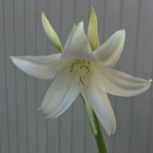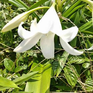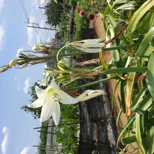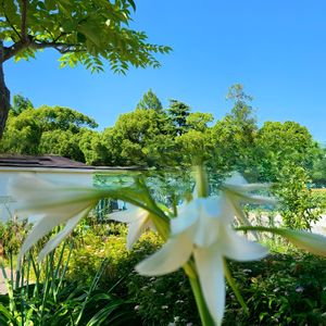 夏の花 『アフリカ浜木綿』の白い花 ヒガンバナ科 多年草 和名 ハマオモト 浜万年青 散歩🚶♀️時 テッポウユリに似た白い大きな香りの有る浜木綿に出会いました~ 青空とのコラボが良い感じでした🤭 花言葉 「どこか遠くへ」 「汚れのない」 「潔癖」