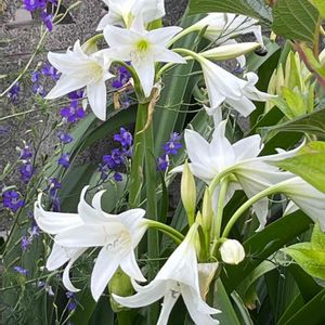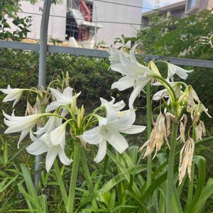 アフリカハマユウ アフリカ浜木綿 ヒガンバナ科ハマオモト属 ハマユウ→アフリカハマユウに修正しました。教えていただきありがとうございます🙏 花言葉 汚れがない 道路脇の植え込みで咲いています。青い空がお似合いです😃
