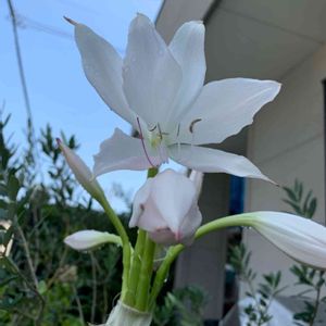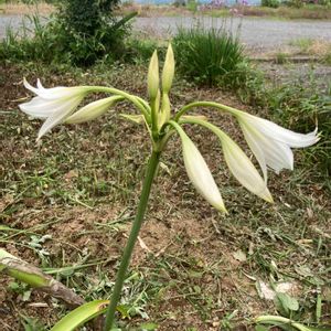 インド(アフリカ)ハマユウ 👣観音崎たたら浜散歩👣 日本の浜木綿とは花の違いがあり、何かと思い調べたら、インドハマユウでした。が、本当は、アフリカハマユウを交配したものらしいです。全体の姿はほぼ同じ。花びらが細くヒラヒラしていなくて、百合みたい。今までこんな違い気づきませんでした😅