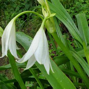初夏から夏に、厚い線形の葉の間からまっすぐ伸びた太い茎先に、大きな純白の漏斗形の花が10数輪、横向きに次々と咲きます。 インドハマユウ(印度浜木綿)。 花の名は、インド原産で葉がハマユウに似ていることからつけられ、ハマユウは白い花が木綿(コウゾの樹皮を細く裂いてつくった繊維)を垂らしたように見えることから名づけられました。 明治初期に渡来したインドハマユウは最近、同定に誤りがあったことが判明し、呼び名がアフリカハマユウに改められたそうです。
