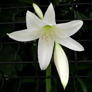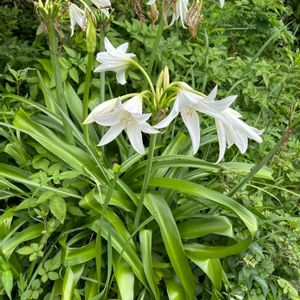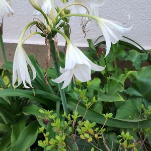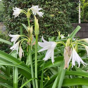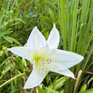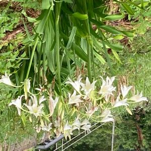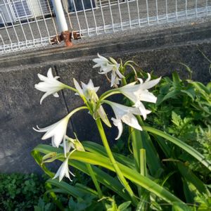 夏の夕方に花茎を伸ばし 先端に白いユリのような 漏斗状の花を咲かせます (畑の花) アフリカハマユウ ヒガンバナ科