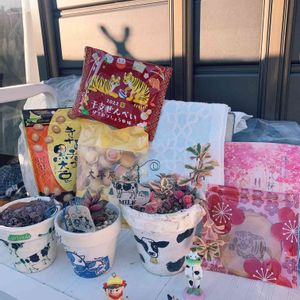 こんにちは❀(*´▽`*)❀〜 🏷牛の日 🏷錦の日 先日、柴犬小夏ちゃんからお散歩ちゃんの お礼便が届きました〜😊 今回も美味しい物いっぱい〜😊😋 小夏ちゃん、 いつも美味しい物(*´∀`)ノ ありがとぅ♪ 毎回、夫が狙ってます🤣🤣🤣 牛の日近かったから、牛の日まで待って 投稿させて頂きました😊 午後から撮ったので画面暗めです すいません〜(❁ᴗ͈ˬᴗ͈)ペコリ。:.゚ஐ⋆* ◀️haruちゃんリメ鉢にパープルヘイズ 真ん中、柴犬小夏ちゃんのリメ鉢には 大和錦 自作リメ鉢にはアトランティス どの子も星にならずに頑張ってます😊 自作リメ鉢、時間経過して色々剥げて 来てます😅 トップコートに紫外線防止の透明クリアの ペンキ、塗ったのになぁ〜🤣🤣🤣