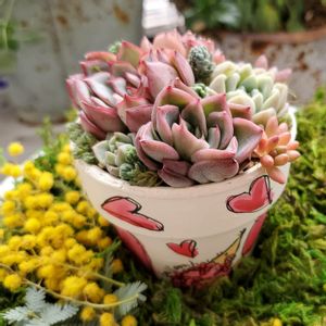 花ネズミ鉢のトランプVer.ハート❤ こちらも寄せ植えしてみました お花は大好きなミモザ 冬の終わり春を告げるように咲き始める黄色いお花はほんわかしていてなんだか優しい気持ちになります😀 お花の寄せ植えは季節ごとにしますが 多肉植物の寄せ植えはセダムなどは小さくて寄せ植えは上手くいきません(><) 寄せ植えはお花も多肉も自己流です