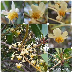 モッコク 木斛 ツバキ科モッコク属 常緑高木 両性花を着けた株 6/23に投稿したものは雄花(雌ずいが退化)ばかりでしたが、両性花は花弁が開く前に雌ずいの柱頭を出す。開花した時は雄しべが雌ずいにへばり着いているが、その後花弁が反り返り雄しべが離れる。左と右上の写真は同じ枝で、右上が1日遅い状態です。