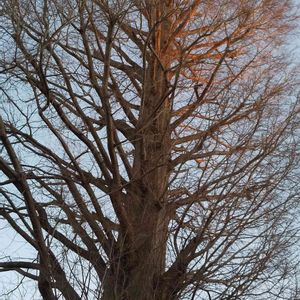 メタセコイヤ 曙杉 ヒノキ科メタセコイヤ属 落葉高木 上の方だけ朝日を受けた巨木。