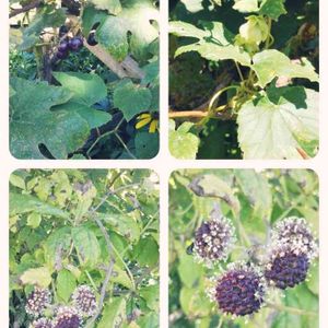 左上 ブドウ(品種不明) 右上 カラハナソウ(たぶん) 下 ケヤマウコギ(推定) そば哲ガーデンにて ブドウ、ヤマブドウかと思って一粒頂いたら甘酸っぱかった🎵