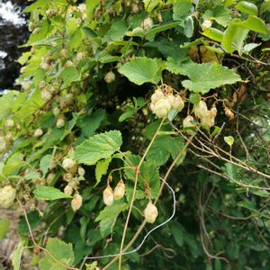 お散歩🚶♀️🚶♂️道で 出会いました。 住宅の壁面に、びっしり ホップでしょうか〜 よく似た カラハナソウ でしょうか〜 足元には、可愛いホトトギス