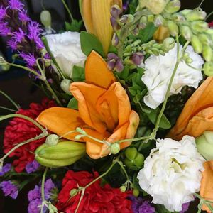 今週の花束!スパイラルも花束単独で立ちました🎶 リアトリス別名ヤリが真っ直ぐなので花束どうかなって思ったけど、どうにかさまになりました。丸い小さいフウセンの先に小さな白い花が咲きます。お名前わかる方おしえて!
