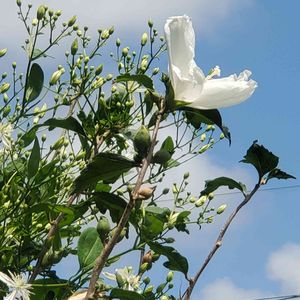 💕今日は二輪咲いています💕 (ムクゲ 木槿 むくげ) 一重咲 大徳寺 白花 蕾がたくさんついてます🍀*゜ 明日はこの蕾が開くのかな? 庭に花が少なくなってきたので 楽しみです🎶((o(。>ω<。)o))