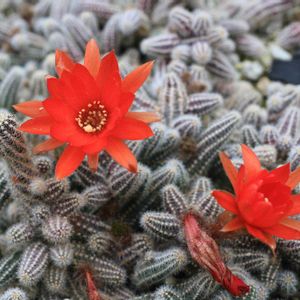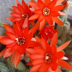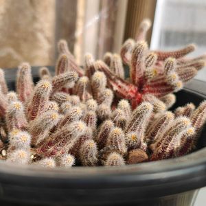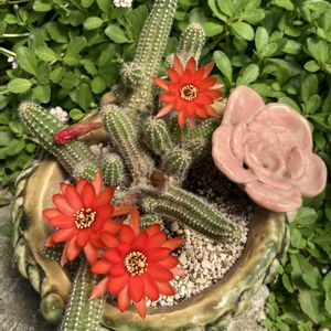 こんにちは♪ 本日2度目の投稿はサボテン白檀です。 普段は毛虫みたいなルックスですが、めちゃくちゃいっぱい花をつけてくれました。 赤い花色がいい感じです。