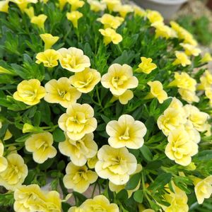 おはようございます🎵 カリブラコア ネオダブル レモン 梅雨前に剪定して 花数も増えて理想の🤭 ドーム状になってきた🧚♀️ ウレシイ♡ でも➰お迎えした時より 色がまばらな所アリ🤐ムム これって栄養が足りないのかな🥺 次切り戻ししたら肥料あげるね🍀