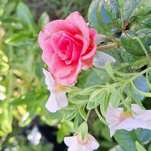 こんにちは🎶 今日のお庭から❀.*・゚❀.*・゚ ミニバラ & カリブラコア (ウノダブル ホワイトピンクペイン) 可愛かったので〜( ˘ω˘ノ)ノ📸カシャ💕︎︎