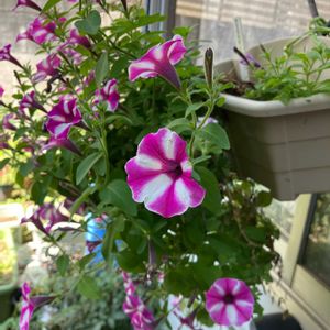 ①山紫陽花 満天星 今年お迎えした苗のうちの一つです。 小さな濃いブルーのお花💙葉っぱの色も綺麗です。 ②寄せ植えのギュギュがやっと開花しました。 なんだかちょっと物足りなくて 何か一つ足してみようかな? ③挿し芽で冬越ししたスーパーベル?とペチュニア また会えて嬉しい☺️