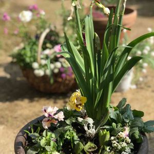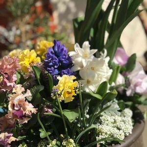 春の寄せ植えしてみました。 ヒヤシンスが咲いたら豪華になるはず。