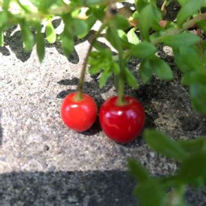 暖地桜桃に小さな桜桃の実🍒 ベランダのめだか(乙姫、東天光スワロー、紅帝)水槽横にて。 初めて育てるので沢山数個しか付いてはいないけれど、大きくなぁれ٩(^‿^)۶