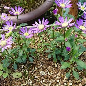 今年も沢山蕾をつけてミヤコワスレの開花が始まりました❁.:*✳︎。゚( ◜◡◝ ) 常緑で暑さ寒さに強く、とても丈夫です😊35cm丸い浅型のプラ鉢で植替えしたのは一度だけなので、株が大きくなりギュウギュウです😅花後に株分け予定です(^ー^)