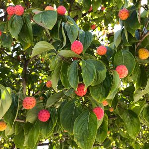 お隣りさんのヤマボウシ 今年も沢山実りました🎶 春の真っ白なお花も綺麗だけど この時期の丸い赤い実も とてもカワイイ💕👌 春も秋も楽しめますね〜🎶👍