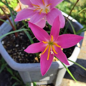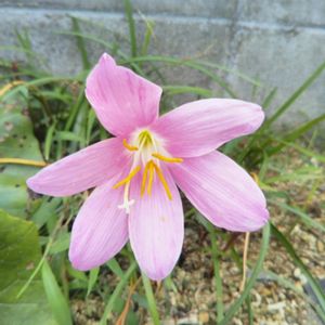 サフランもどき💗 散歩中、ピンクのお花を見つけ、ナツスイセンかも〜❓と近づいてみると、蕊が違うような、、、🧐よく似ていますねー🤗
