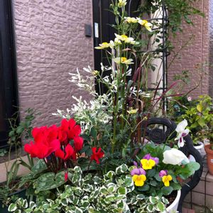 昨日作った寄せ植え ミニ葉牡丹と、ガーデンシクラメン、 蕾つき赤葉センニチコウは 買ってきたもので、 ほかは、ハンギングやリースをばらしたものから 再利用😁💕