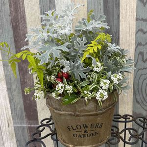 白妙菊とアリッサム、チェッカーベリーの寄せ植え