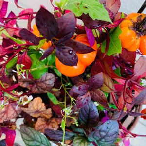 秋色の寄せ植え 秋の深まりと ともに 🌱葉っぱの化粧が、とってもお洒落🎼 ソラナムパンプキン ヒューケラ ヘミグラス 紅センニチコウの葉 ユーフォリビア