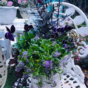 ダークな色の寄せ植え ビオラ タキシード 金魚草 スイートアリッサム 庭から掘り上げたポリゴナムとリシマキア