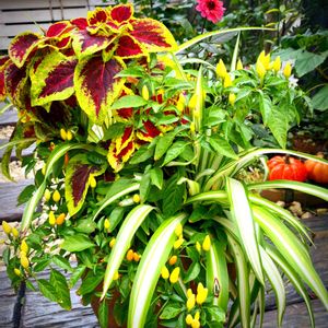 おはようございます😃 今日は曇り空です。 夏の終わりに寄せ植えしたものが、わさわさしてきました。 プチダリアは2輪だけ。 観賞用唐辛子が爆咲き! オリヅルランは11月になったら、室内で過ごします。