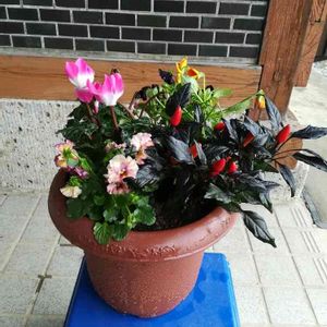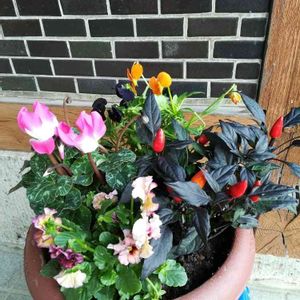 こんにちは👋😃 秋の寄せ植えしましたよ🍀観賞用トウガラシ、ハロウィンビオラ、サーモンシクラメン、ミルフルピンクフリル