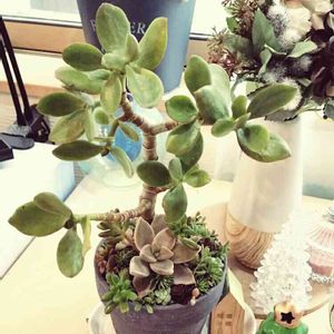 祖母からもらった金のなる木が一枝折れ、、😢⤵⤵ 今週末に来客があるのに備えて、高さのある盆栽風寄せ植えに仕立てました。素焼き鉢はかわいすぎて4つ買いしたDAISO製。 ずっと室内では保てないので、来週からはエントランスを飾ります。