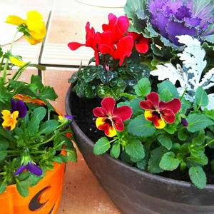 寄せ植え❗パンジーとビオラ。シクラメンも。並べると可愛いらしさましますね。赤と黄色のビオラ!紫と黄色のビオラどちらもいい掛け合わせができた種。